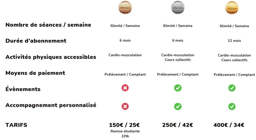 • Cardio Training : exercices cardio-respiratoire principalement sous forme d'ateliers (intensité modérée et élevée)